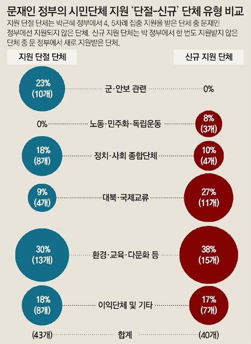문재인 정부에서 지원이 끊어진 단체 및 신규 진입한 단체의 활동 분야 카테고리를 비교해 볼 때 밝고힘찬나라운동본부, 선진화시민행동 같은 종합 정치·사회단체 또는 군사·안보·북한인권 단체에 대한 지원은 끊어졌다. 반면 에코유스, 한국장애인인권포럼 등 환경·청소년·소수자 관련 단체가 다수 새로 편입됐다.