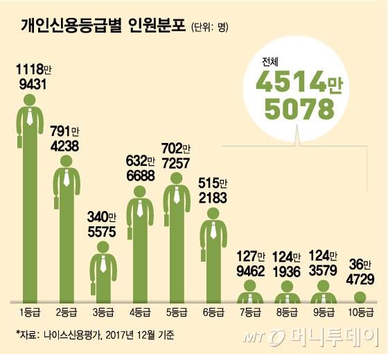 보통 직장인은 3~4등급에 분포한다. 대출을 연체없이 갚고 신용카드도 적절하게 사용하면 1~2등급으로 올라갈 수 있다. 하지만 대출과 카드 사용 등 신용거래 경험이 적은 경우 등급을 평가할 수 있는 근거가 빈약해 주로 5~6등급에 해당한다. 정보씨와 같은 학생이나 사회초년생들이 주로 분포하는 등급이다. 7등급 이하는 대출이나 카드론 등에서 장기연체 경험이 있거나 연체 규모가 큰 경우다. 사실상 1금융권 거래가 어려워 대출이 필요하면 고금리의 2금융권 문을 두드려야 한다.
