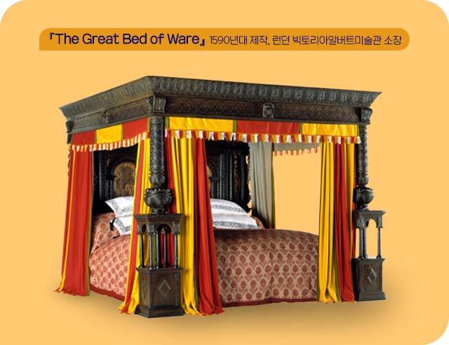 비슷한 시대에 사용됐던 침대들을 봐도 상류층을 중심으로 여러 개의 베개가 사용된 경우를 찾을 수 있었다. 1590년대 영국에서 제작된 침대 < The Great Bed of Ware >를 살펴보자. 런던 인근에 있는 숙박업소에서 쓰던 것으로 3.38m × 3.26m의 거대한 크기, 그리고 화려한 침구로 유명세를 탔다. 몇 년 후 셰익스피어가 발표한 희극 '십이야(Twelfth Night)'에서 언급되기도 했으며, 300여 년이 지난 후에도 각종 서적에 등장했다.