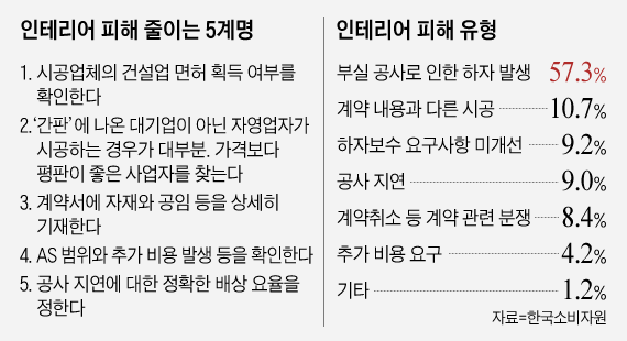 한국소비자원에 접수된 인테리어 관련 피해 중 가장 많은 것은 부실공사로 인한 하자 발생(57.3%)이었다. 계약 내용과 다른 시공(10.7%), 하자보수 요구 사항 미개선(9.2%), 공사 지연(9%), 계약 관련 분쟁(8.4%), 추가비용 요구(4.2%) 등이 뒤를 이었다. 한국소비자원은 "공사금액이 1500만원 미만인 경우 건설업 등록을 하지 않은 사업자도 시공할 수 있기 때문에 하자 발생이 많은 것 같다"고 설명했다.