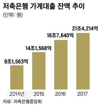 25일 저축은행중앙회에 따르면 저축은행의 가계대출 잔액은 2014년 9조1,563억원에서 지난해 말 기준 21조4,214억원으로 133% 급증했다. 저축은행들은 2011년 대규모 대출부실 사태를 겪으면서 2010년 53조4,779억원에 달하던 기업대출 잔액을 2014년 17조원까지 줄였는데, 줄어든 기업대출을 메우려고 가계대출 영업을 대폭 늘렸다는 게 금융당국의 분석이다.