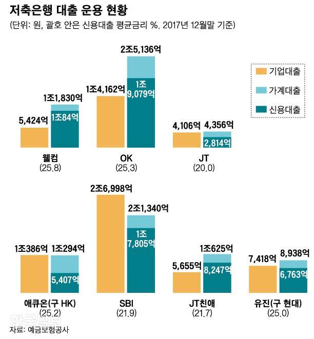 특히 일부 저축은행은 가계 신용대출 실적이 전체 기업대출 실적을 앞질렀다. 지난해 351억원의 순이익을 낸 웰컴저축은행의 지난해 가계 신용대출(평균금리 25.8%) 실적은 1조84억원으로 기업대출(5,424억원)보다 1.8배 많다. JT친애저축은행도 가계 신용대출 잔액(8,247억원)이 기업대출(5,655억원)을 크게 앞질렀다. SBI(1조7,805억원), 유진(구 현대ㆍ6,763억원), 애큐온(구 HKㆍ5,407억원)도 고금리 신용대출을 많이 한 곳으로 꼽혔다.
