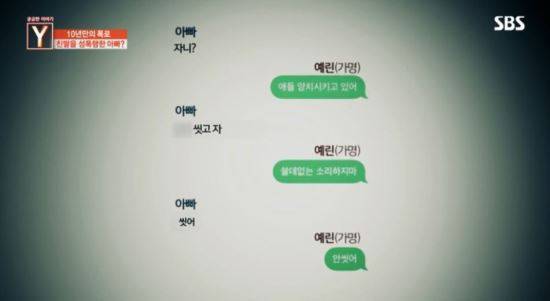 친아버지에게 10년간 성추행과 성폭행을 당했다고 주장하는 딸의 사연이 25일 SBS ‘궁금한 이야기Y’에서 다뤄졌다. 미성년자인 하예린(가명)양은 “아빠에게 벗어날 수 없을 거라고 생각했다. 그냥 살인자와 다를 게 없는 사람 같다”며 자신의 성폭력 피해 사실을 고백했다. 충격적인 이 사연은 방송 이후에도 수많은 커뮤니티로 퍼지면서 논란이 되고 있다.