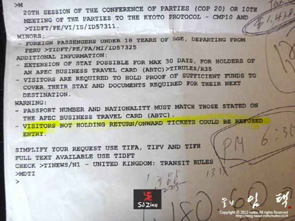 한바탕 소동이 벌어졌다. 결국, 받아 든 최종 탑승권은 오후 3시에 떠나는 리마행 직행표였다. 다행히 거의 동일한 가격이었다. 고객과 친구의 차이란 이런 것인가 보다. 비행기에 오른 후 자리에 앉아 다시 한번 필담을 주고받았던 종이를 펼쳐 보았다. 직원이 실랑이를 벌이던 중 내밀었던 종이였다. 노란 줄을 친 문장이 눈에 들어왔다. ‘페루를 방문하는 자가 왕복표를 가지고 있지 않은 경우 입국을 불허한다’ 비로소 모든 오해가 풀렸다. 항공사 직원이 얼마나 답답했을까. 그토록 설명해도 못 알아들으니.
