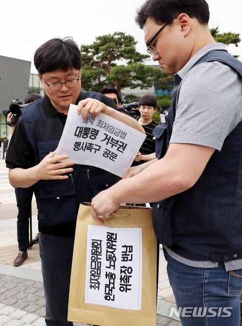 한국노총은 최저임금법 개정안이 국회를 통과한 것과 관련 "청와대가 최저임금법 개악안에 거부권을 행사해야 한다"고 요구했다.