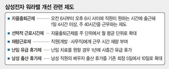 삼성전자의 혁신은 직원 '워라밸(Work and life balance·일과 삶의 균형)'에서도 나타나고 있다. 삼성전자는 '선택적 근로시간제'와 '재량근로제'를 오는 7월부터 도입한다. 하반기부터 법정 근로시간이 주 52시간으로 제한되는 가운데 유연한 근로제도로 근무 효율성을 높이자는 취지에서다.