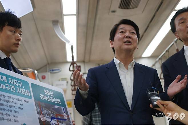 안 후보는 지난 28일 서울시장 철도대책 공약 발표를 위해 지하철 1호선에 올랐다. 그는 이 자리에서 탑승객들을 상대로 준비한 판넬을 활용해 대중교통 공약을 상세히 설명했다.
