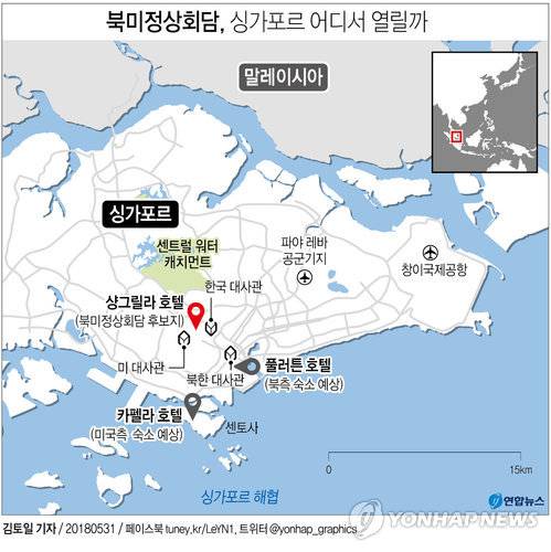 이런 가운데, 싱가포르 유력신문인 스트레이츠타임스가 회담장소로 샹그릴라호텔, 미국과 북한 정상 숙소로 현재 실무팀이 체류 중인 카펠라호텔과 풀러턴호텔이 각각 유력하다고 보도하면서 북미 양측의 회담장 및 숙소 선정이 임박한 것 아니냐는 관측을 낳고 있다.