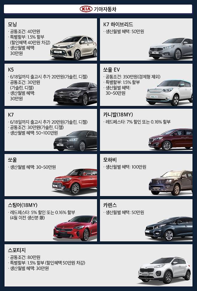모닝 구매 시 40만원 할인과 최저 1.5% 초저금리 할부 중 선택 가능하다. 쏘울 EV의 할인 금액은 350만원이다. K5와 K7을 6월18일 이내 출고 시 50만원 지원한다. 스팅어와 카니발은 2018년형에 한해 저금리할부가 적용된다. 스포티지는 80만 할인 또는 1.5% 저금리에 30만 지원, 120만원 상당의 LG 건조기 중 선택할 수 있으며, 차령 5년 이상 경과차 보유자는 최대 30만원을 추가로 깎아준다. 생산월별 할인을 적용하는 얼리버드 특별혜택을 통해 모닝, K5, 스포티지 구매 시 30만원을, K7은 50만~100만원을 지원한다.