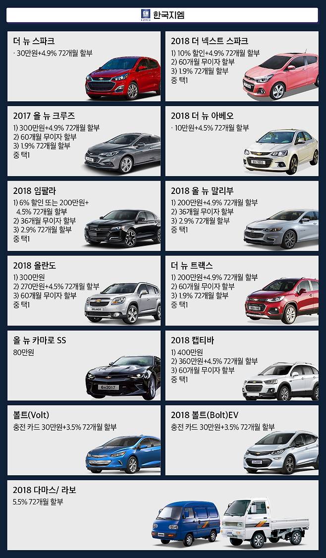 2018년형 스파크는 최대 10%를 할인한다. 말리부와 트랙스의 경우 특정기간 재고분을 대상으로 최대 200만원의 할인과 할부 프로그램(4.9%, 72개월)을 제공하는 콤보할부 프로그램, 또는 할인과 보증기간 연장(7년/14만㎞)을 묶은 프로그램 중 선택할 수 있다.