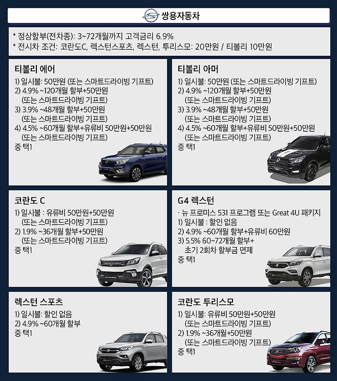 코란도 및 티볼리 브랜드 일부 트림을 대상으로 특별 할인을 적용하고, 50만원 상당의 스마트 드라이빙 기프트를 증정한다. 코란도C나 투리스모 일부 트림을 일시불 또는 정상할부 구매 시 150~200만원, 티볼리 아머 또는 에어 일부 트림은 100~200만원을 할인한다.