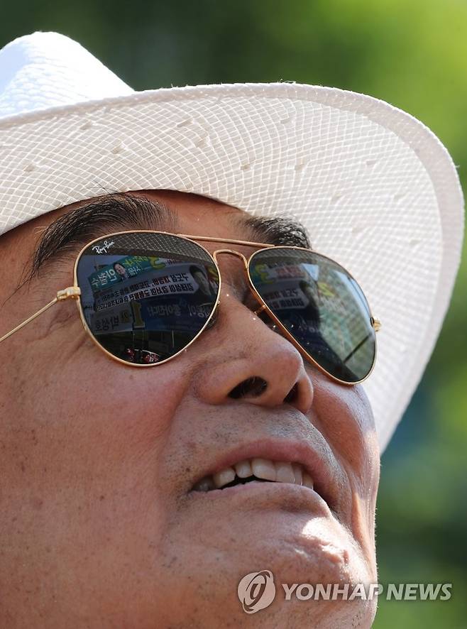 (서울=연합뉴스) 김주형 기자 = 3일 오후 서울 강서구 방신시장 네거리에서 열린 자유한국당 집중유세를 바라보는 한 어르신의 선글라스에 6.13 지방선거 후보들의 현수막이 비치고 있다. 2018.6.3