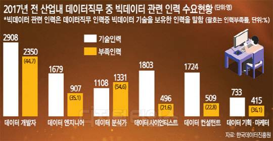 한국데이터진흥원이 최근 발표한 '2017년 데이터산업 현황조사'에 따르면 지난해 기준 전 산업의 데이터 직무 중 빅데이터 인력 부족률은 37.6%로 빅데이터 전문 인력은 매우 부족한 실정입니다.