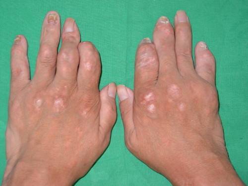 통풍은 약 85~90%가 한군데 관절에 나타나는 대표적인 급성관절염으로, 주로 엄지발가락·발목·무릎 등 하지의 관절에 흔히 발생한다. 특히 엄지발가락은 통풍 환자의 90% 이상에서 관절염이 나타날 정도로 특징적 관절 부위이다. 발작이 있으면 해당 관절에서 손댈 수 없을 정도의 극심한 통증을 경험하게 된다. 관절이 부어오르며 붉게 되거나 열감이 느껴진다. 통증이 너무 심해 밤에 잠을 못 이룰 정도이며, 심지어 신발을 신기조차 힘든 경우도 많다. 이런 증상은 발병 후 1~2일 동안은 통증과 염증이 점점 심해지다가 1~2주간에 걸쳐 저절로 좋아지기는 하나, 한번 경험한 사람에게는 통증발작이 재발하는 경우가 흔하다. 초기에 치료를 제대로 하지 않으면 시간이 지날수록 통증발작 횟수는 많아질 뿐만 아니라 요산의 결정체가 덩어리를 이루어서 피하조직에 침착하여 딱딱한 혹을 만들게 된다. 이렇게 생긴 혹은 귓바퀴와 팔꿈치, 발가락, 손가락 등의 관절 주변부에 잘 침착된다. 요산이 침착된 부위는 불룩 튀어나온 모양으로 보이는 통풍 결절이 생기게 된다. 통풍을 방치해 계속 혈중 요산 농도가 높은 상태로 유지되면 요산에 의한 요로결석이 형성되는 일도 있고, 신장 자체의 기능이 떨어져서 요산성 신병증이 발생하기도 한다.