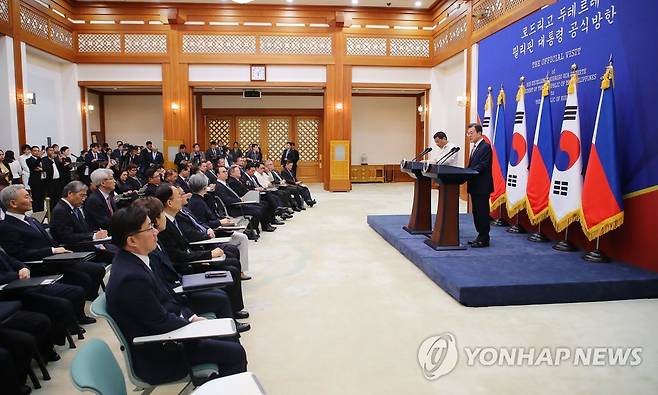 (서울=연합뉴스) 황광모 기자 = 문재인 대통령과 로드리고 두테르테 필리핀 대통령이 4일 오후 청와대에서 열린 한·필리핀 정상 공동언론발표에서 회담 결과를 발표하고 있다. 2018.6.4