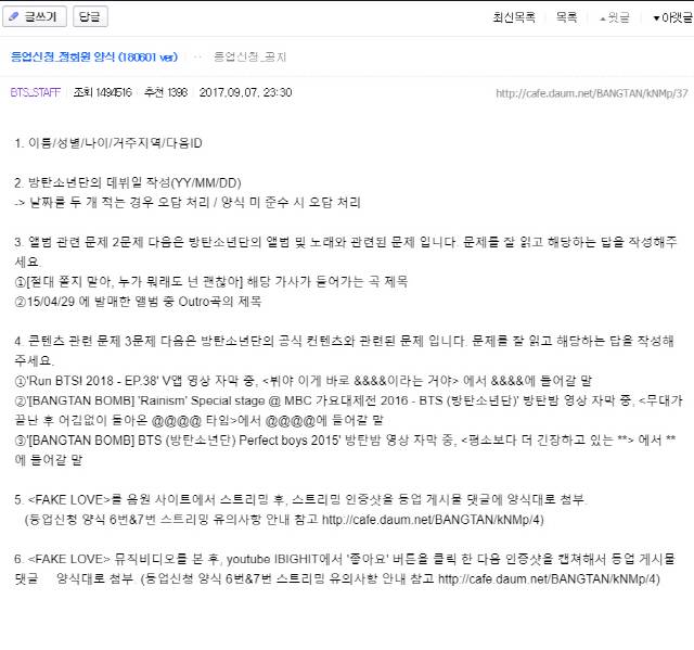 단순히 ‘등업신청 합니다’라 남기면 안된다. 정해진 양식에 맞춰 작성해야 한다. 이름, 성별과 같은 기초적인 정보에서 방탄소년단의 데뷔일과 같은 간단한 문제 그리고 심화문제 몇 가지를 맞춰야 한다. 게다가 이 심화문제는 매주 달라진다. 지난 1일부터 3일까지 이뤄진 정회원 신청에서는 앨범 관련 2문제와 콘텐츠 관련 3문제가 출제됐다. ‘절대 쫄지 말아, 누가 뭐래도 넌 괜찮아’라는 가사가 들어가는 곡과 2015년 4월 29일에 발매한 앨범 중 아웃트로(마지막)곡의 제목을 묻는 앨범 관련 문제는 쉽게 답을 찾을 수 있었다. 포털사이트에 검색하면 금세 답을 구할 수 있다.