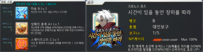가장 특징적인 것은 액티브 스킬인 카리스마, 군략, 번개의 정복자 3개 스킬이 모두 캐릭터의 필살기인 보구의 대미지를 극대화시킨다는 점이다.