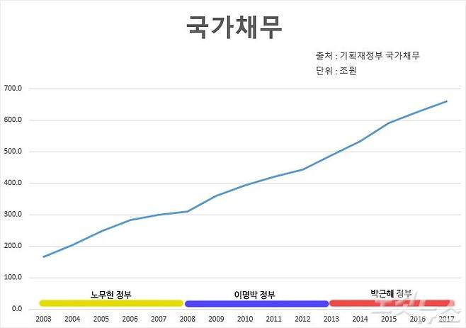 기획재정부가 집계하는 국가채무현황 자료를 살펴보면 노무현 정부가 시작된 2003년부터 현재까지 국가채무는 꾸준히 증가하고 있는 것으로 나타났다.