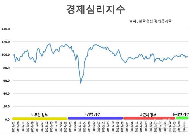 경제심리지수가 가장 나빴던 때는 세계금융위기가 있은 2008년 이명박 정부 때였다.