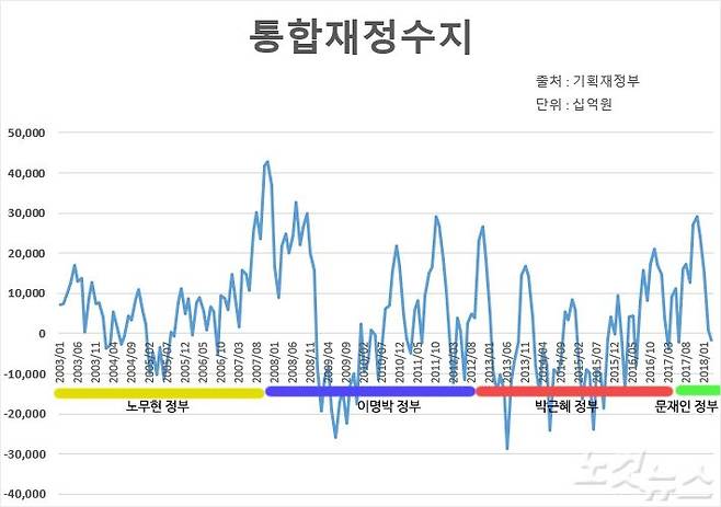 일반회계·특별회계·기금을 모두 포괄하는 통합재정수지는 지난 15년간 등락을 반복했다. 문재인 정부 출범 이후 통합재정수지는 계속 증가하는 추세다.