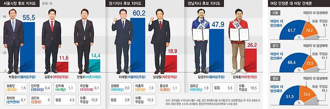 <한겨레>와 한겨레경제사회연구원이 여론조사 전문기관 ‘한국갤럽’에 의뢰해 각 지역 유권자들을 상대로 2~4일 실시한 여론조사(신뢰수준 95%, 표본오차 ±3.4~3.5%)에서 박원순 후보는 55.5%의 지지를 받아 14.4%의 지지를 받은 안철수 바른미래당 후보, 11.6%의 지지를 얻은 김문수 자유한국당 후보를 크게 앞섰다. 보수야당에서 대선주자급 거물 정치인이 2명이나 출마했는데도 서울시장 3선에 도전하는 박 후보가 우위를 지킨 것이다. 이재명 후보도 60.2%의 지지를 얻어 남경필 자유한국당 후보(18.9%)를 멀찌감치 따돌리고 ‘대세론’을 재확인했다. 경남지사 선거에 나선 김경수 후보도 47.9%의 지지를 얻어 26.2%의 지지를 얻은 김태호 후보를 20%포인트 이상 앞섰다.