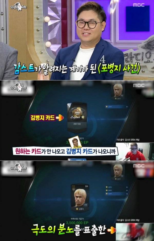 이날 토크 도중 감스트를 크게 알리는데 기여한 일명 ‘포병지 사건’이 언급됐다. 과거 감스트가 온라인 방송 도중 축구 카드를 뒤집는 게임을 하다 4개 연속으로 김병지 카드가 나오자 욕을 하면서 분노를 표출한 사건.