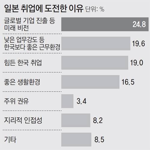 ④회사 요구만 맞추면 왕따가 될 수 있다? 일본 기업들은 “한국 취준생의 강점은 적극성”이라고 강조한다. 하지만 일본 기업이 한국인에게 원하는 요구와 동료들 사이의 줄타기가 중요하다. 일본 현지 인력전문회사 파소나의 이연경 부사업부장은 “일본 기업들은 한국인의 적극성을 통해 사내 창의성을 키우고, 조직을 활성화시키려 한다”며 “하지만 외국인 동료가 지나치게 적극적이면 동료들로부터 일본 특유의 따돌림을 당하기 쉽다”고 설명했다. 이 때문에 2, 3년 만에 퇴사하는 젊은이도 적지 않다. KOTRA, 한국산업인력공단, 한국무역협회 등에서 지원하는 프로그램이나 취업박람회 이용을 추천한다. 사전에 지원서를 받고 일본 기업이 원하는 인재를 매칭한 후 면접을 보기 때문에 보다 쉽게 일본 취업 기회를 얻을 수 있다. 김윤종 기자 zozo@donga.com
