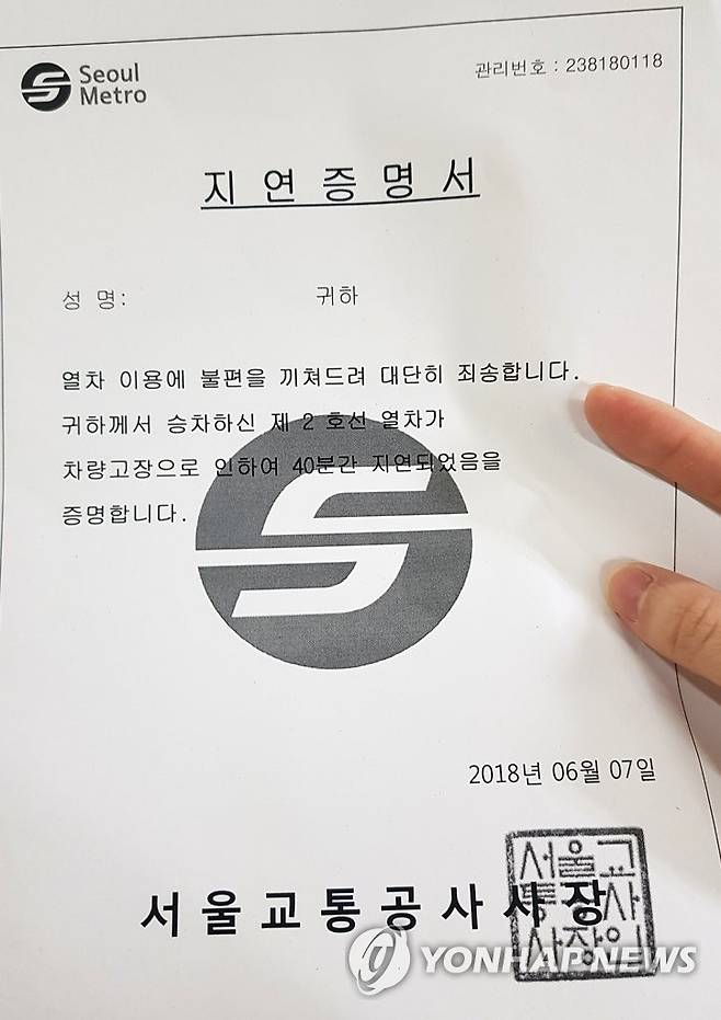 (서울=연합뉴스) 황정현 기자 = 7일 오전 8시 20분께 서울지하철 2호선 합정역에서 연기가 나 2호선 운행이 지연됐다. 사진은 열차 지연운행으로 서울교통공사가 출근길 시민들에게 교부한 '지연증명서'. 2018.6.7