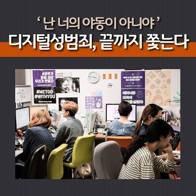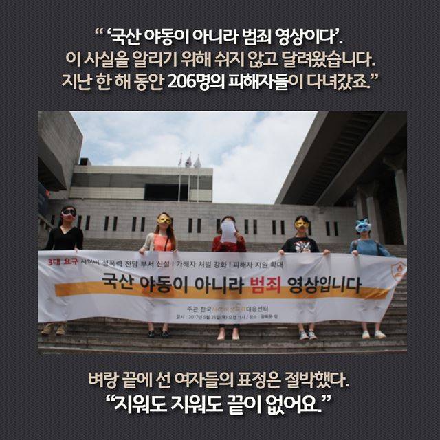 “'국산 야동이 아니라 범죄 영상이다’. 오직 이 사실을 알리기 위해 1년이 넘는 시간 동안 쉬지 않고 달려왔습니다. 지난 한 해 동안 206명의 피해자들이 저희 단체의 문을 두드렸어요.” 벼랑 끝에 선 여자들의 표정은 절박했다. “지워도 지워도 계속 나와요. 끝이 없어요.”