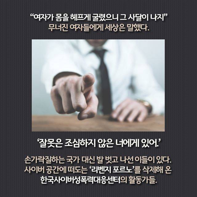 “여자가 몸을 그렇게 헤프게 굴렸으니 그 사달이 나지” 무너진 여자들에게 세상은 말했다. ‘잘못은 조심하지 않은 너에게 있어.’ 손가락질하는 국가 대신 발 벗고 나선 이들이 있다. 사이버 공간에 떠도는 ‘리벤지 포르노’를 삭제해 온 한국사이버성폭력대응센터의 활동가들.