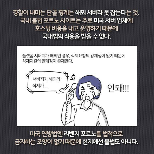 경찰이 내미는 단골 핑계는 “해외 서버라 못 잡는다”는 것. 국내불법 포르노 사이트는 주로 미국 서버 업체에 호스팅 비용을 지불하고 운영하기 때문에 국내법의 적용을 받을 수 없다. 미국 연방법엔 리벤지 포르노를 법적으로 금지하는 조항이 없기 때문에 현지에선 불법도 아니다.