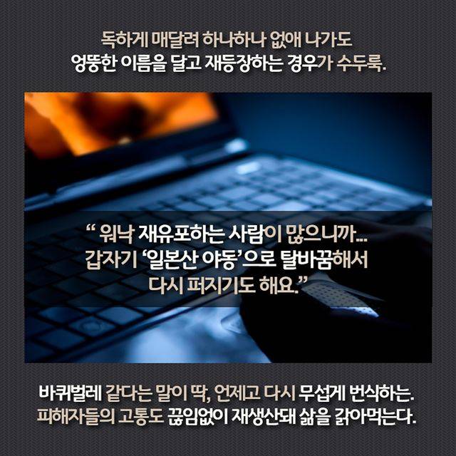 독하게 매달려 하나하나 없애 나가도 엉뚱한 이름을 달고 다시 등장하는 경우가 수두룩하다. “워낙 재유포하는 사람이 많으니까... 갑자기 ‘일본산 야동’으로 탈바꿈해서 다시 퍼지기도 해요.” 바퀴벌레 같다는 말이 딱. 언제고 다시 무섭게 번식하는. 피해자들의 고통도 끊임없이 재생산돼 그들의 삶을 갉아먹는다.