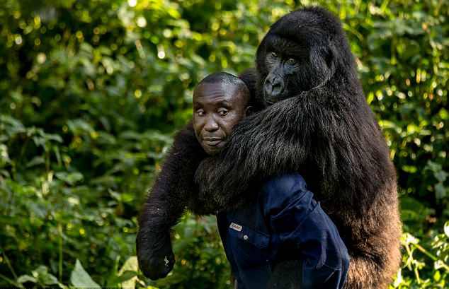 사진 속 마운틴고릴라는 이 관리자의 등에 업히기도 하고, 둘은 마주보고 앉아 마치 가족처럼 서로의 눈길을 응시하기도 한다.
