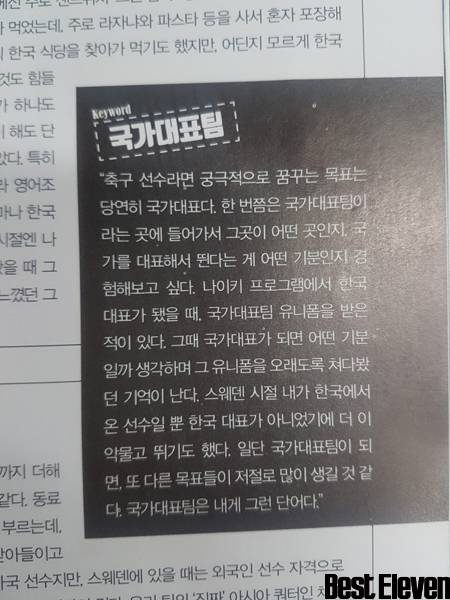 인터뷰 방식은 이랬다. 여러 키워드가 적힌 카드를 뒤집어서 놓으면, 문선민이 이 중 하나를 무작위로 골라 키워드에 맞게 스스로 이야기를 풀어나갔다. 공교롭게도, 문선민이 처음으로 집은 카드가 바로 ‘국가대표’였다. 순간 적막이 흘렀다. 당시는 문선민 스스로는 물론 그 누구도 문선민과 국가대표를 쉽게 연관짓지 못하던 때였다. 한국이 스웨덴과 같은 조에 속하기도 전이고(정확히는 본선 진출도 확정하기 전이다), 문선민 역시 이제 막 K리그 팬들에게 이름을 알린 정도였기 때문이다.