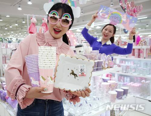 【서울=뉴시스】 11일 서울 다이소 대치역점에서 모델들이 유니코니 시리즈 용품을 소개하고 있다.