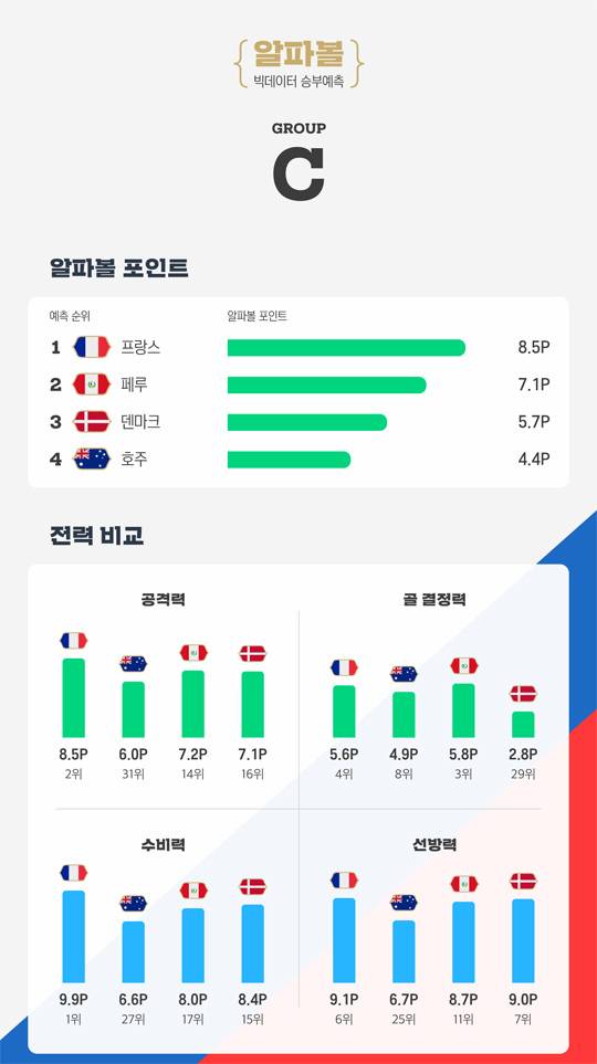 프랑스는 국가별 공격력과 골 결정력, 그리고 수비력과 선방력 등을 모두 더해 종합 평가한 수치인 알파볼 포인트에서 C조에서 가장 많은 8.5점을 받았다. 2위 페루와 비교해서도 1.4점, 그 페루와 치열한 다툼을 벌일 것으로 예상하는 덴마크와는 2.8점이나 격차를 내고 있다. 또한 프랑스는 공격력·수비력·골 결정력·선방력 등 모든 수치에서 나머지 팀들을 압도했다. 이변이 없는 한 조 선두가 확실시된다는 전망을 내린 것이다.