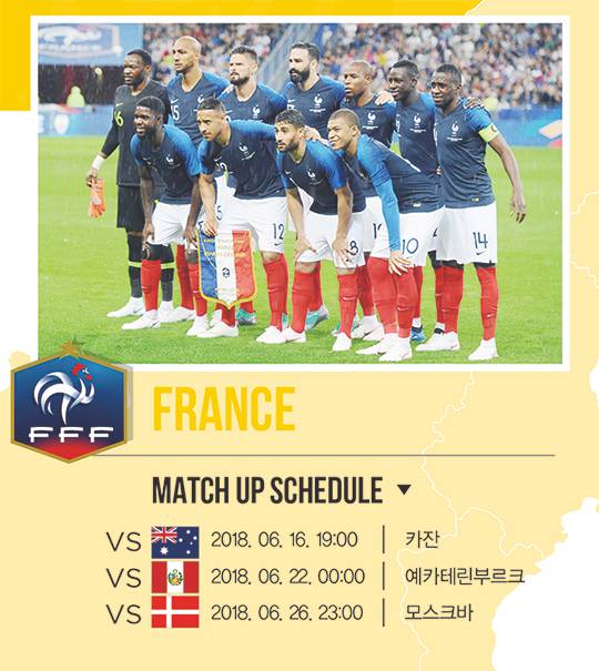 앞서 지금의 프랑스를 지네딘 지단이 중심이 됐던 2000년대 초반의 프랑스와 비교했다. 물론 이름값으로 따지면 지단 세대가 훨씬 눈부시다. 기껏 비벼볼 만한 선수가 앙투안 그리즈만이나 폴 포그바 정도다. 그런데도 프랑스를 우승후보로 꼽는 이유는 이번 대회 출전 팀 중 23명의 기량 차가 가장 적기 때문이다. 어느 선수가 들어가도 데샹 감독의 주문을 충실히 수행할 만한 능력을 갖추고 있다. 지난 대회 챔피언 독일이 보여주었듯, 월드컵에서는 이런 팀이 더 강하다.