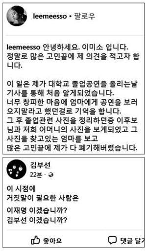 김씨의 딸인 배우 이미소 씨는 11일 인스타그램을 통해 "졸업사진을 정리하던 중 이 후보님과 저희 어머니의 사진을 보게 됐고 그 사진을 찾고 있는 엄마를 보고 많은 고민 끝에 제가 다 폐기해버렸다"며 "저희 엄마 그 자체가 증거이기에 더 이상 진실 자체에 대한 논쟁은 사라져야 한다"고 주장했다.