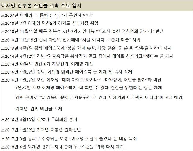 11일 배우 김부선씨 딸 이미소씨가 자신의 소셜 미디어 페이스북에 자신의 어머니와 이재명 더불어민주당 경기지사 후보가 연인 관계였다는 글을 올렸다. 앞서 당사자인 김부선씨도 이 후보와 연인 관계였다고 밝힌 바 있다. 이 사안은 지방선거 막바지에 최대의 스캔들이 되고 있다. 이 후보와 김씨가 그동안 밝힌 이야기 가운데 무엇이 맞고 틀린지 따져봤다.