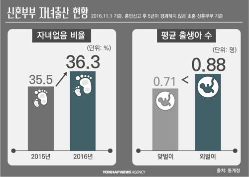 신혼부부 10명 중 3명은 현재 아이가 없다. 통계청의 '2016년 기준 신혼부부통계 결과' 보고서에 따르면 2015년 11월 1일 기준으로 5년 이내에 혼인 신고한 초혼 신혼부부 115만1천 쌍 가운데 36.3%는 자녀가 없었다. 아이를 낳지 않는 비율은 전년 대비 0.8%포인트 높아졌다.