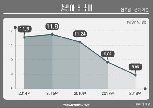 출산 기피 현상이 뚜렷해 지면서 연간 출생아 수는 지난해 35만7천700 명으로 40만 명 선이 처음 붕괴했다. 올해 1분기 출생아 수는 8만 명대로 추락, 1분기 기준 역대 최저 수준을 기록했다.