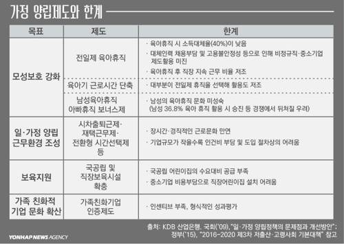 양서영 KDB산업은행 연구원은 '여성의 경력단절 문제와 해외사례' 보고서에서 "현재 한국의 일과 가정 양립제도들은 선진국 수준에 근접하지만, 중소기업·비정규직 노동자의 제도 활용 미진, 경직적인 직장문화와 과다한 업무량으로 제도 활용에 한계가 있다"고 지적했다.