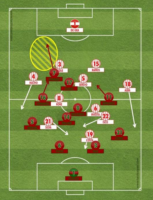 (스페인 4-2-3-1 포메이션 : 1데 헤아 – 4나초, 3피케, 15라모스, 18알바 – 5부스케츠,8 코케 – 6이니에스타, 21실바, 22이스코 – 19코스타 / 감독 페르난도 이에로)