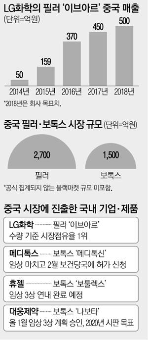 LG화학 관계자는 "중국은 어느 정도 소득 수준이 되는 중산층이 필러 시술을 받기 때문에 단순 가격보다는 제품에 대한 신뢰와 효과가 더 중요한 선택 기준"이라며 "한국산 제품에 대한 높은 신뢰도와 LG의 글로벌 브랜드가 긍정적으로 작용하면서 시장점유율 1위로 올라섰다"고 설명했다. 2700억원 규모로 추정되는 중국 필러 시장에는 국내 업체 LG화학, 휴온스, 동국제약이 진출해 있다.