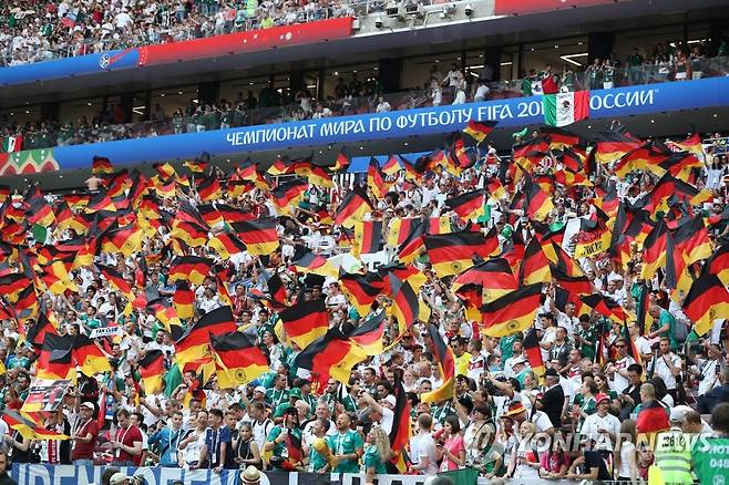 (모스크바=연합뉴스) 진성철 기자 = 17일(현지시간) 모스크바 루즈니키 스타디움에서 열린 2018 러시아월드컵 F조 독일-멕시코 경기에서 독일팬들이 국기를 흔들며 응원하고 있다. 2018.6.17