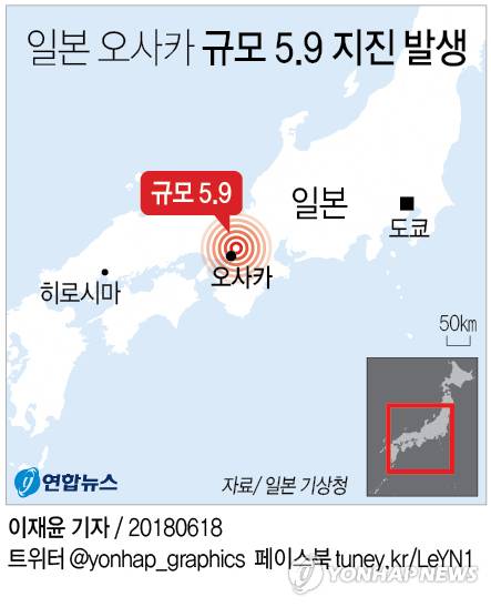 (도쿄=연합뉴스) 김병규 특파원 = 18일 오전 7시 58분 일본 오사카부(大阪府)에서 규모 5.9로 추정되는 지진이 발생했다고 일본 기상청이 밝혔다.