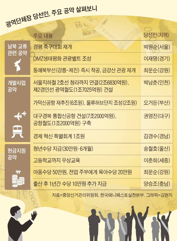 6·13 지방선거 광역단체장 당선인들이 후보자 때 내놓은 공약의 실천 여부가 지역 주민들의 관심을 끌고 있다. 공항 건설에서부터 지하철 연장, 4차 산업혁명 거점 구축, 물류허브단지 조성까지 대형 개발사업이 적지 않고, 무상 복지 정책이 대거 확대될 것으로 예상되기 때문이다.