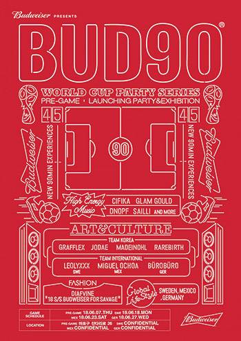 2018 FIFA 러시아 월드컵 공식 후원 브랜드 버드와이저가 월드컵 응원파티 ‘버드 90(BUD 90)’을 연다. 버드 90은 버드와이저를 상징하는 ‘버드(BUD)’와 관중들의 응원 열기가 고조되는 축구 경기시간 ‘90분’을 의미한다. 지난 7일 진행된 첫 ‘BUD 90’ 파티에서 버드와이저는 브랜드 전용 공간 ‘버드 하우스’에서 한국 월드컵 대표팀의 평가전 관람과 함께 미술작품 전시회와 디제잉 공연을 즐기는 색다른 파티를 마련했다. 또한 ‘월드컵’을 주제로 한 국내외 실력파 디자이너들의 예술작품들도 함께 관람할 수 있도록 작품 전시 공간을 마련했다. 이날 행사에선 그라플렉스(GRAFFLEX), 이덕형(MADEINDHL), 레어버스(RAREBIRTH), 조대(JODAE) 등 국내 실력파 디자이너들과 한국의 월드컵 조별예선 상대국인 스웨덴, 멕시코, 독일 출신 아티스트들이 참여하며 화제가 됐던 바. 버드와이저는 대한민국 조별 예선 경기일인 18일(스웨덴 전), 23일(멕시코 전), 27일(독일 전)에 맞춰 매번 다른 이색 공간에서 각 나라의 라이프스타일을 반영한 관람 파티를 열 계획이다. 버드와이저 페이스북 페이지와 인스타그램에서 만 19세 이상에 한해 참여신청이 가능하다.