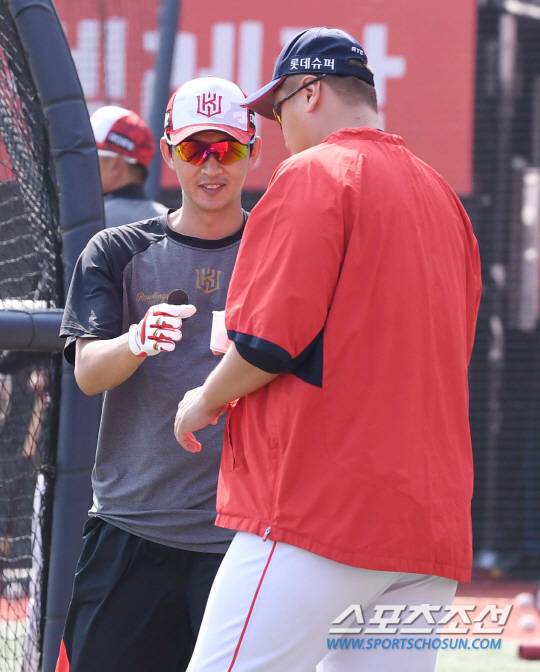 kt 박기혁이 20일 오후 수원 kt위즈파크에서 열릴 2018 KBO리그 롯데와의 경기에 앞서 이대호에게 음료수를 받아들고 있다.