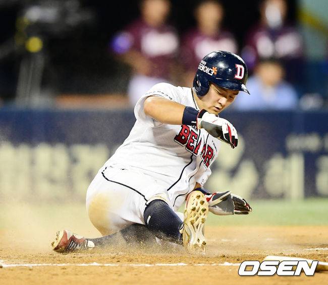[OSEN=잠실, 민경훈 기자] 21일 오후 서울 잠실구장에서 열린 '2018 신한은행 MY CAR KBO 리그' 두산 베어스와 넥센 히어로즈의 경기, 7회말 2사 주자 1,2루 두산 오재일의 중견수 앞 1타점 적시타때 최주환이 홈으로 몸을 던져 세이프 되고 있다./ rumi@osen.co.kr